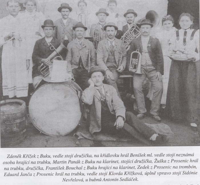 První fotka je místní kapela v roce 1893 z vystoupení na plese. Kapela hrála i na populárních staromládeneckých bálech.