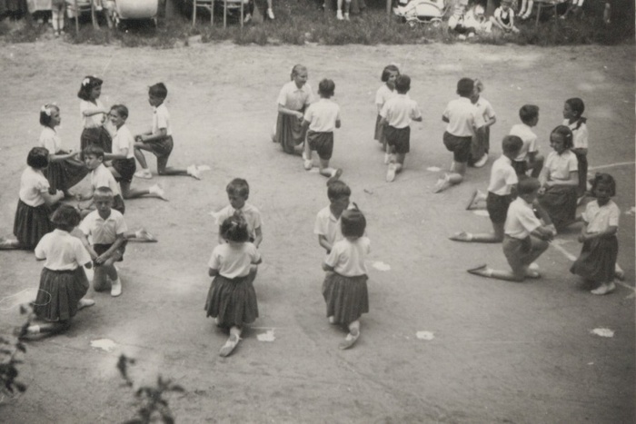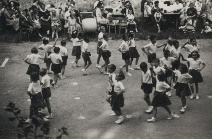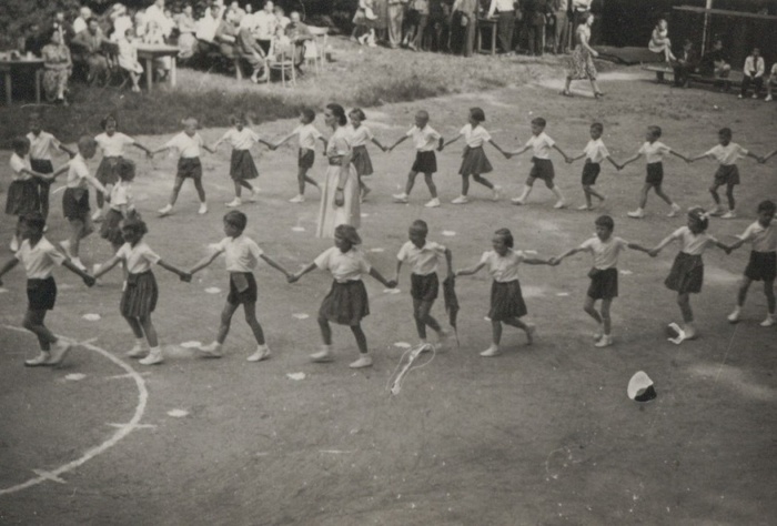 Děti na hřišti tančí českou besedu.